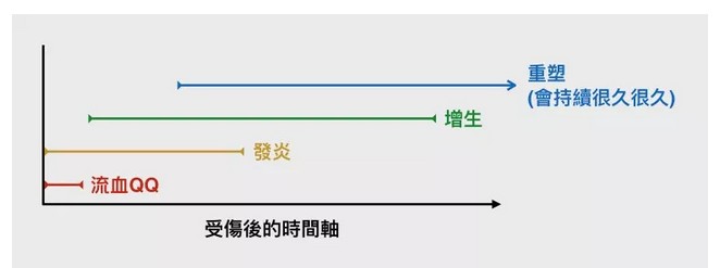 你身體的軟組織受傷修復分成四個階段,第一階段是受傷流血,第二個階段是發炎反應,第三個階段是增生增殖,第四個階段是重新塑型。